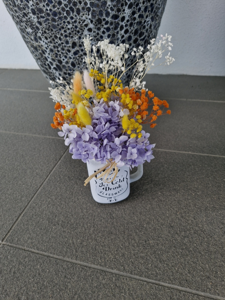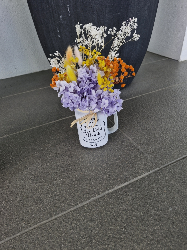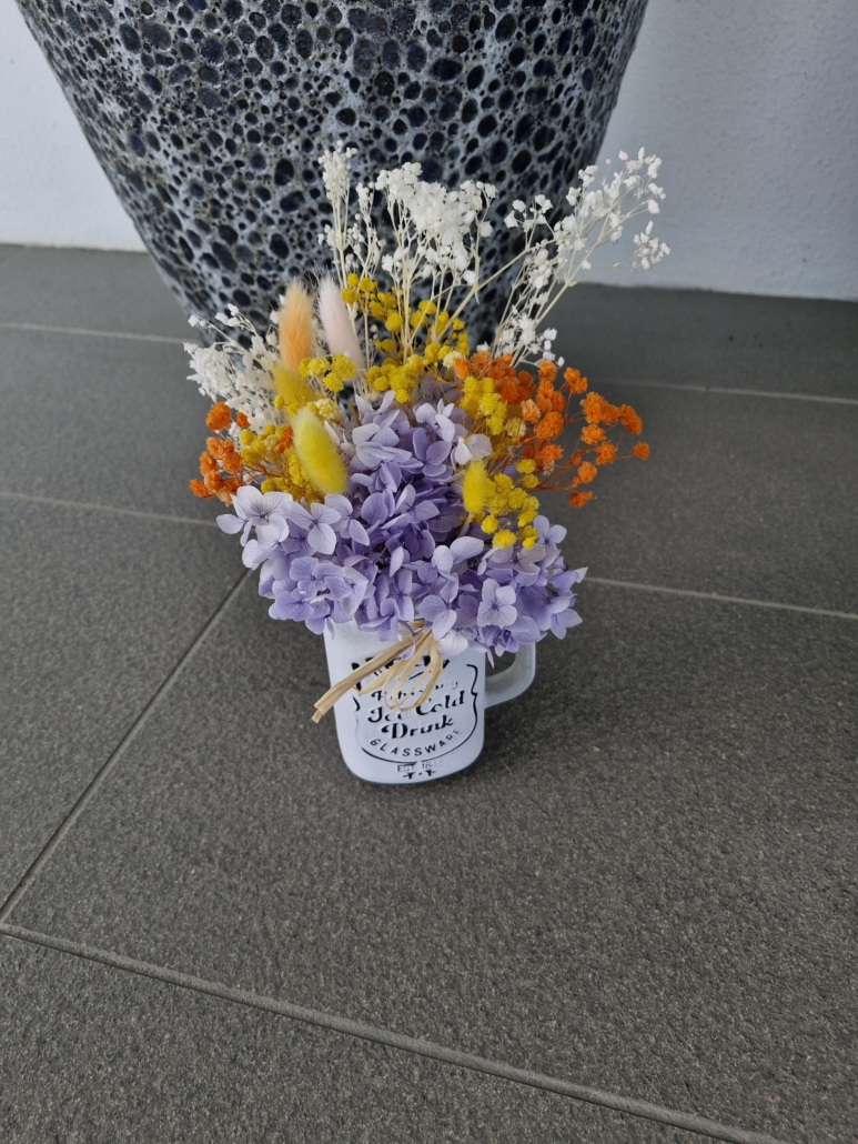 little cut pot preserved dry flowers arranged